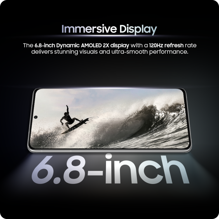 It features a 6.8-inch Dynamic AMOLED 2X display with a 120Hz adaptive refresh rate, delivering vibrant colors and smooth scrolling. Enjoy seamless gaming sessions with fluid graphics, making every movement and detail come to life.